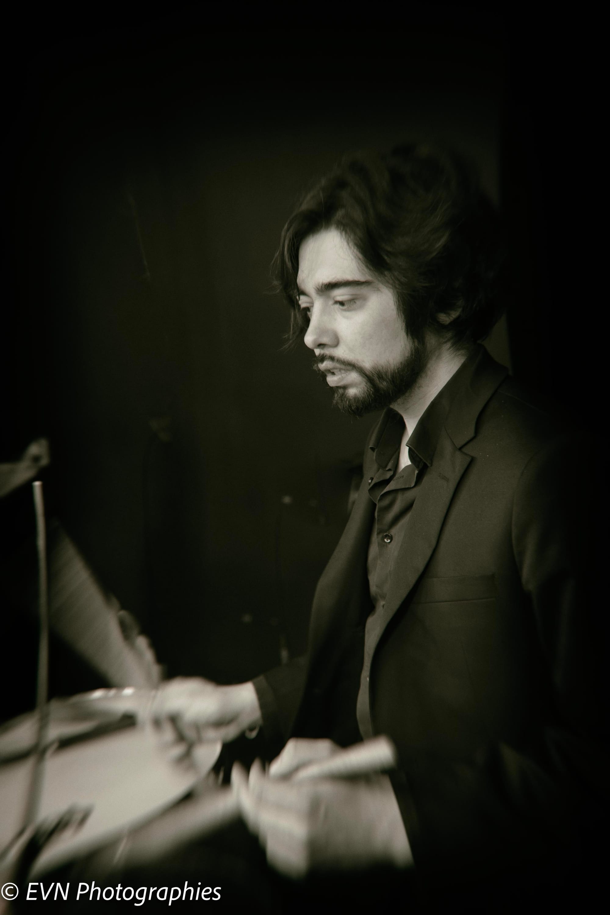 Édouard joue toutes les percussions et batteries. Il chante aussi.